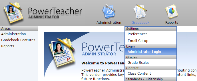 3. At the top of the PT Administrator screen you will see three icons/tabs. Hover over the Gradebook tab and then click Administrator Login.