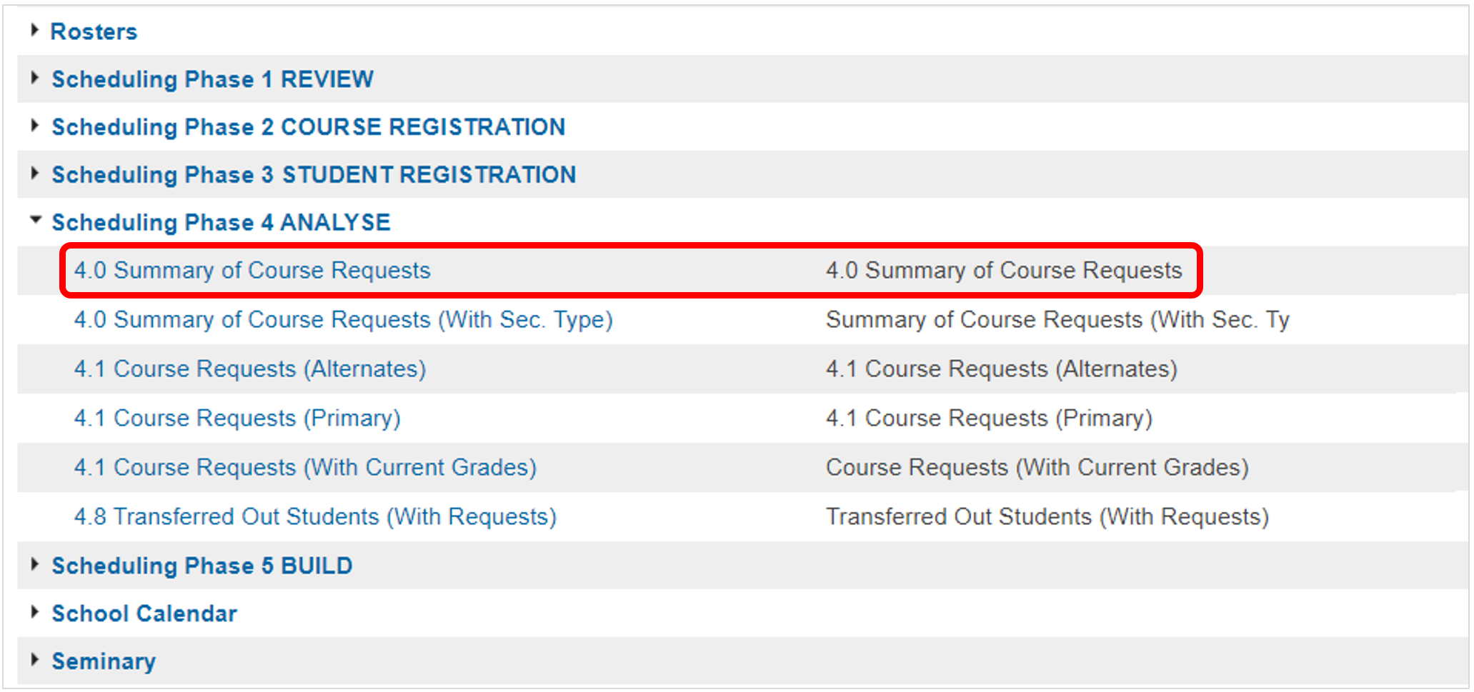 1. Go to Start Page > SQL Reports > Scheduling Phase 3 TRACK AND ANALYZE > 4.0 Summary of Course Requests