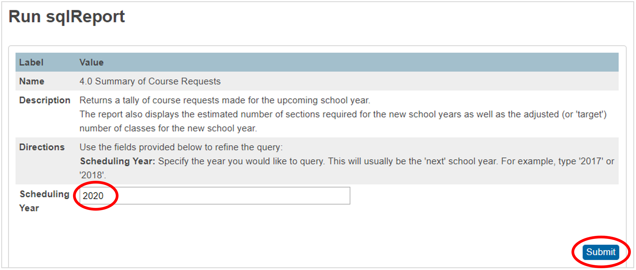 2. On the Run sqlReport page, specify the year you would like to query. For example, type “2019” or “2020” etc in the Scheduling Year field provided, then click Submit: