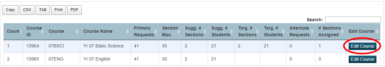 | Sugg. # Students | The “suggested” number of students that should be assigned to each section (class). This is an automatically calculated number based on the number of requests received and the suggested number of sections (classes) for each course. |