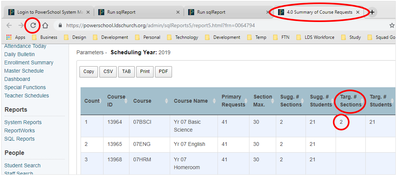 5. Next, navigate back to the Summary of Course Requests tab and then click the Refresh button (or hit F5) to refresh the data on the page. You should notice that the Targ. # Sections has been updated. Repeat this process for every Course: