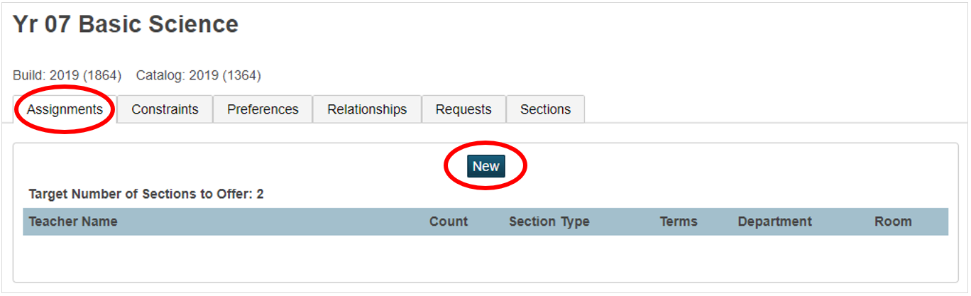 2. The Course Information page will open in a new tab. On the Course Information page, click on the Assignments tab. Click the New button to add a new teacher assignment:
