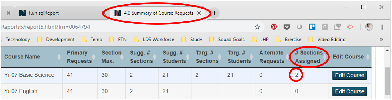 6. Next, navigate back to the Summary of Course Requests tab and then click the Refresh button (or hit F5) to refresh the data on the page. You should notice that the # Sections Assigned has been updated. Repeat this process for every course: