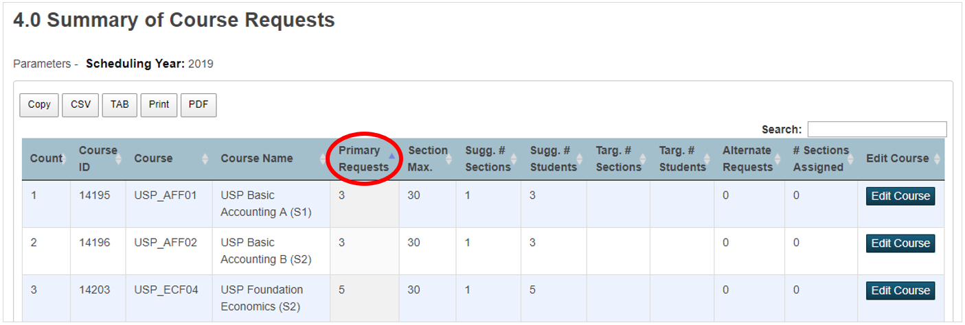 By default, the report is ordered alphabetically by the Course Name. You can click on any of the columns, to sort (and re-sort) the data from lowest to highest, and alphabetically from A-Z or Z-A etc. Simply click on the Column Header one or more times to sort the data as per your preference. Once you refresh the page, the data will default to the alphabetical listing by Course Name. The example below shows the data sorted by Primary Requests from lowest to highest: