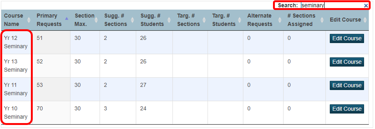| Targ. # Students | The “target” number of students that should be assigned to each section (class). This is an automatically calculated number based on the number of requests received and the target number of sections (classes) specified for each course. |